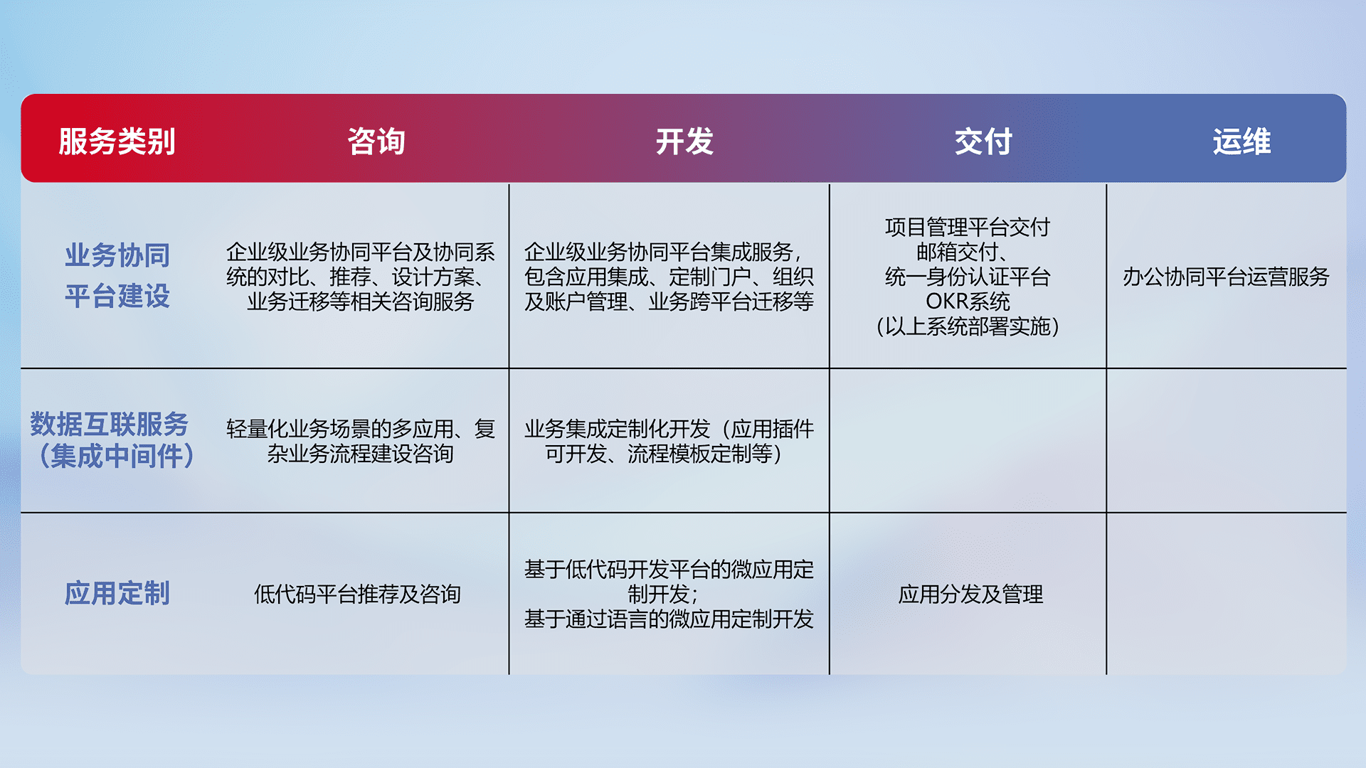 针对钉钉、、、企微、、、IDaas等平台级产品提供产品的规划、、、方案、、、、交付、、、定制化开发等服务,,实现如统一协同办公、、、智能客户服务、、混合会议管理、、智能数据查询、、、等业务场景,,实现数字化转型。。。。