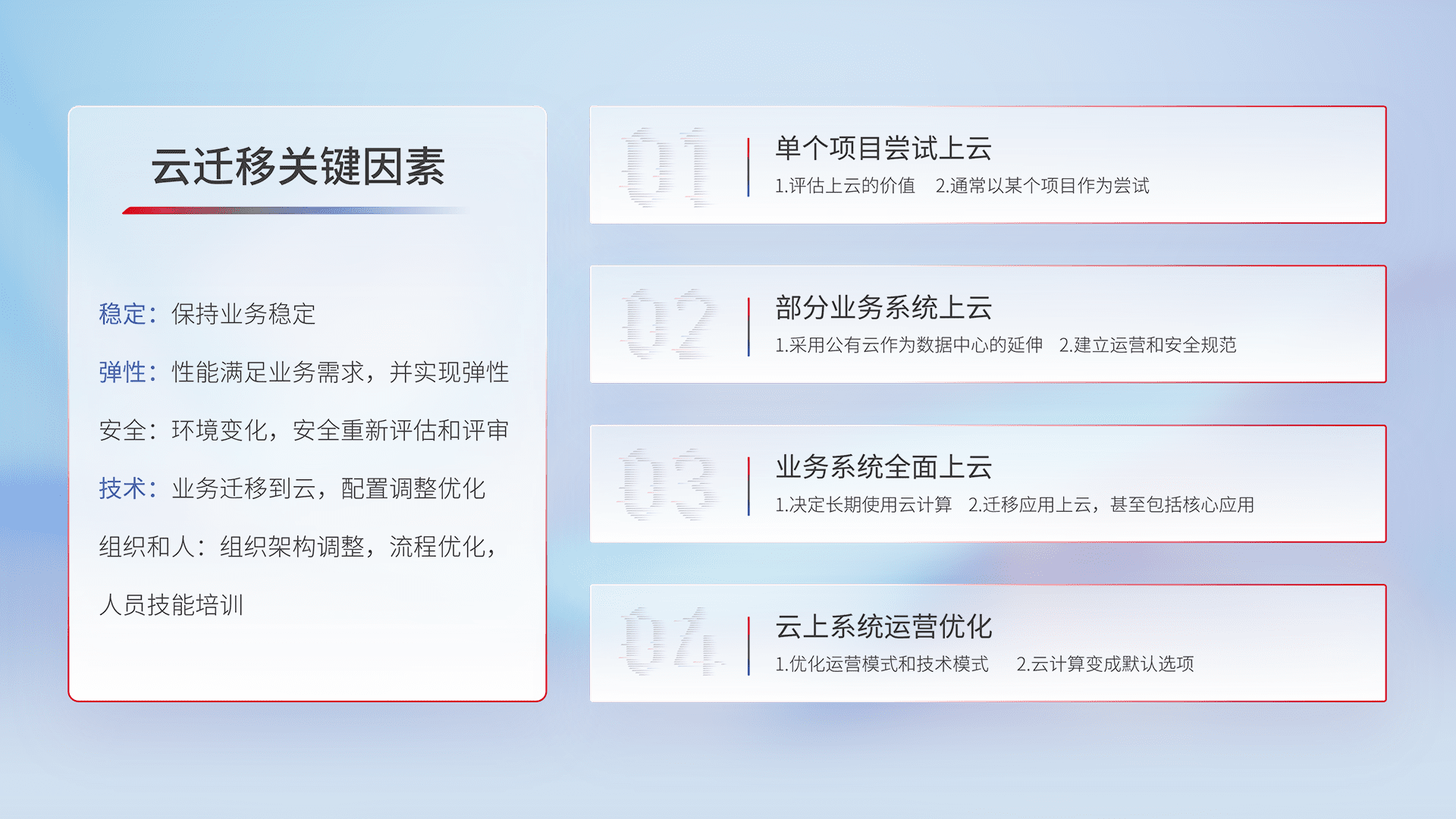 结合实际业务,,从规划设计、、云平台选型、、云原生改造、、、数据迁移、、集成交付,,,迁移全过程为客户识别最佳上云路径,,,做好风险识别管理,,,设计网络架构、、身份权限、、安全审计合规、、、操作审计、、、日志审计、、、、监控告警策略、、、、多站点容灾设计等,,,,对云上基础设施进行整体规划,,,,提升IT治理水平,,,以满足弹性、、、、高可用、、、、高性能的需求。。。