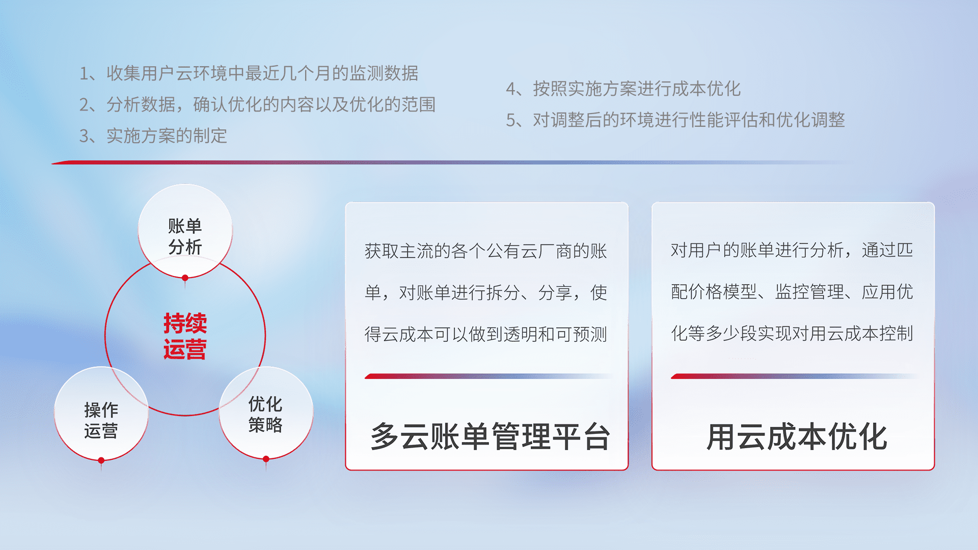 通过多云纳管,,,以统一的资源数据模型把客户的云资源进行抽象和封装,,,进而实现对多云资源的统一操作,,,保障云资源管理的可靠性、、、、稳定性与可用性。。。量身定制化运维内容,,,配置、、、、开发运维、、、补丁管理、、、备份、、、监控、、认证和访问管理、、、审计和日常巡检等,,保障在用云过程中的可靠度,,,稳定度以及高可用率。。。。